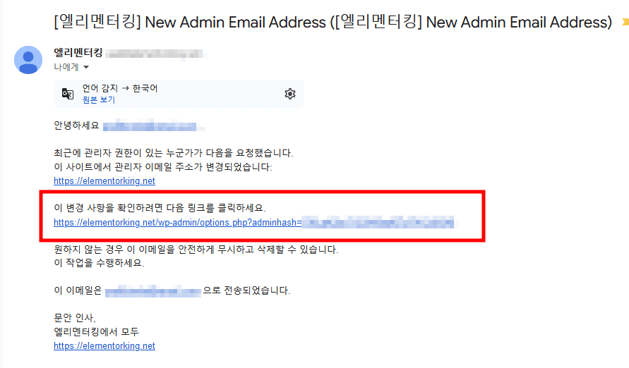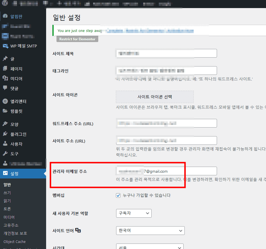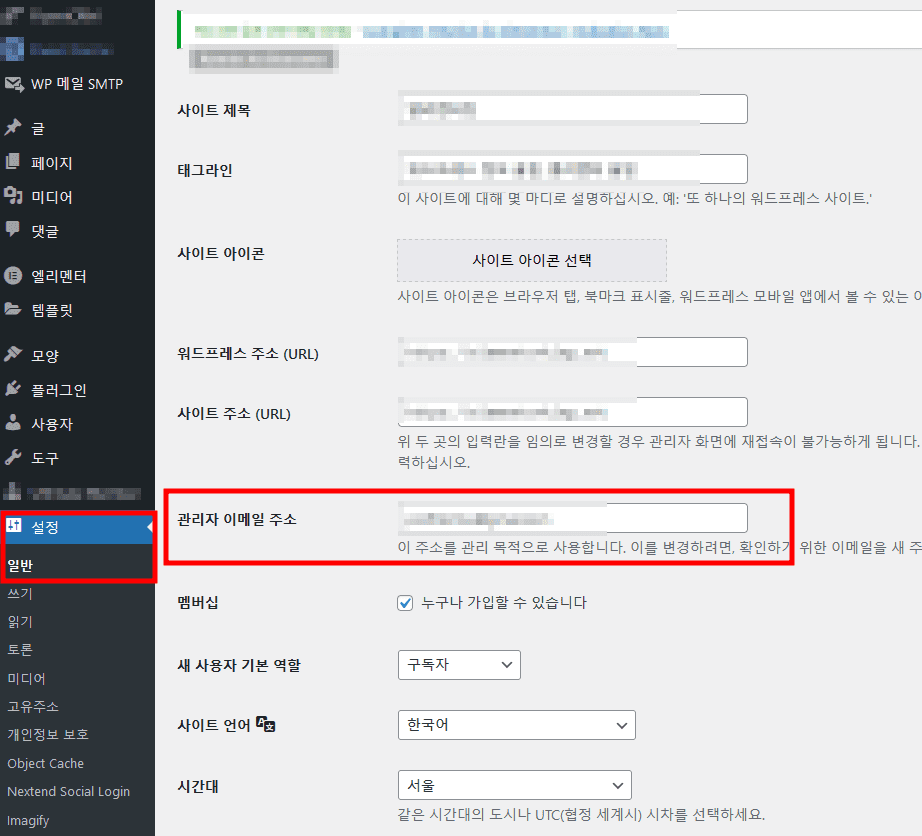 설정 > 일반 > 관리자 이메일 주소에 변경하고자 하는 이메일을 입력합니다.