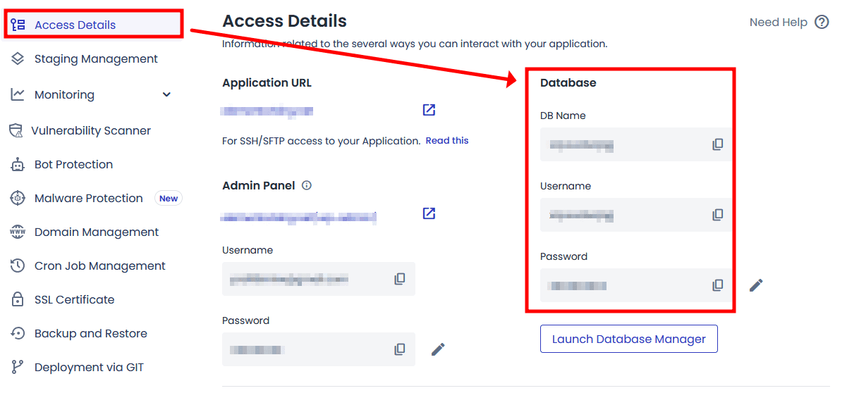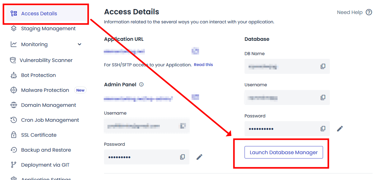 위는 Cloudways 서버 화면 입니다. 이메일 변경을 원하는 웹사이트를 선택하고 Access Details > Launch Database Manager로 이동합니다.