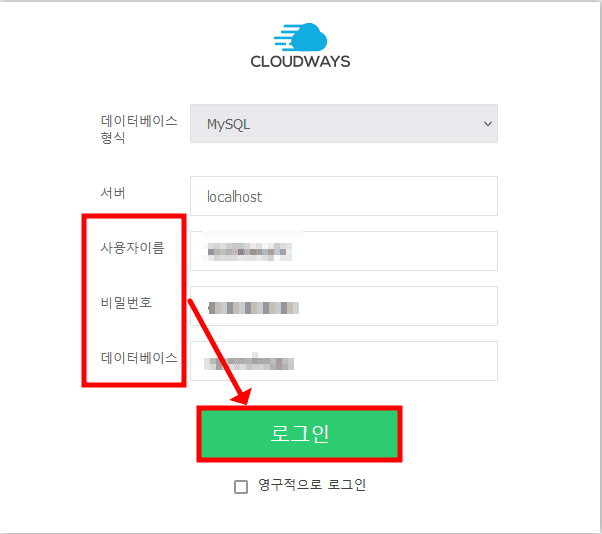 클라우드 웨이즈 Access Details에서 Database 값을 가져와서 아래에 붙여 넣어줍니다.