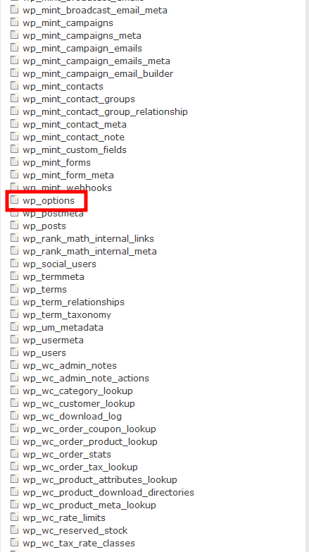 Ctrl/Commmand + f를 눌러서 wp_options을 찾아줍니다. 또는 wp_options을 찾아서 확인할 수도 있습니다.