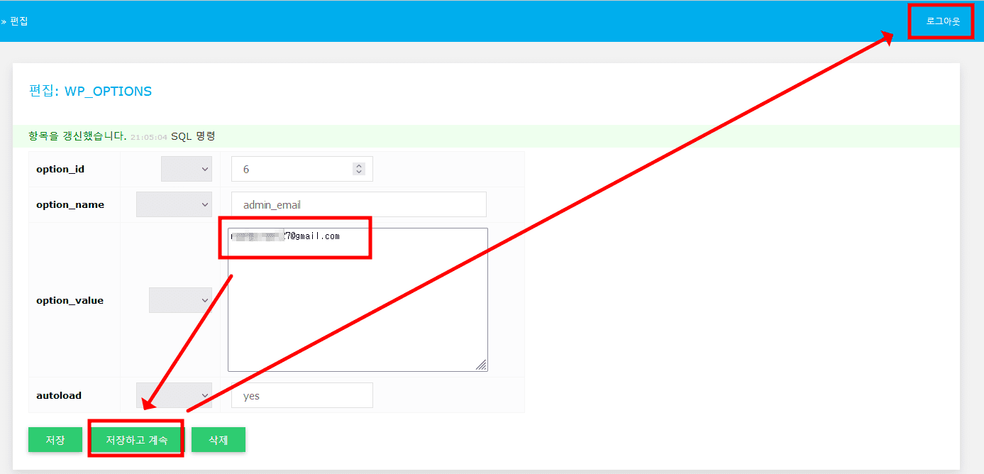 원하는 이메일을 option_value에 입력 후 저장하고 계속 > 로그아웃을 진행합니다.